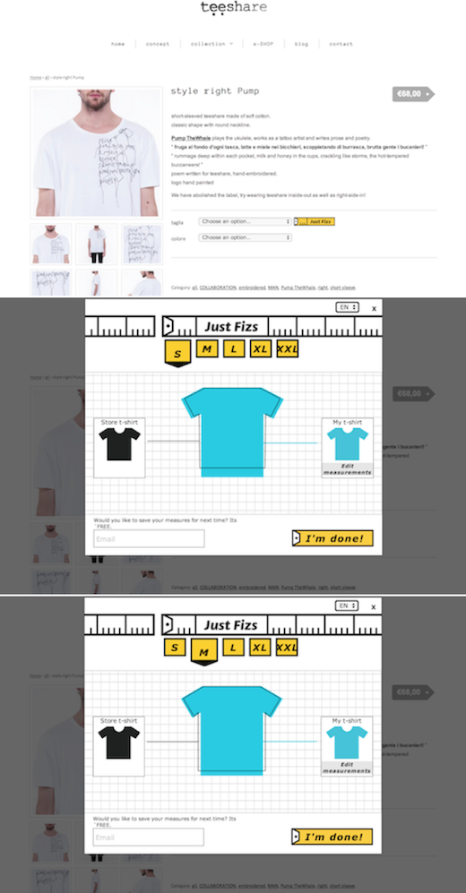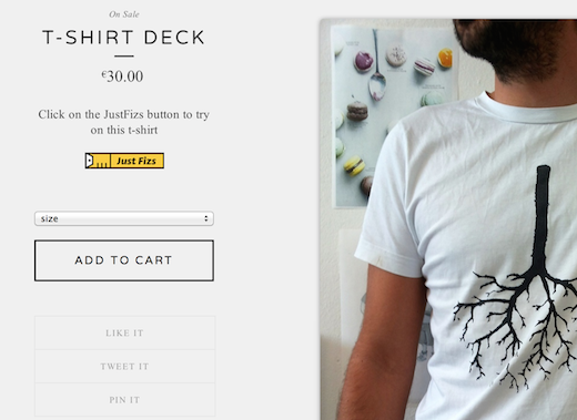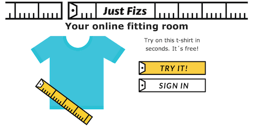 Justfizs is a button (like Facebook´s, Twitter´s, etc) that can be easily integrated into the seller's website. When a user clicks it, a pop-up appears, and the user gets to make a visual comparison of his favorite t-shirt and the one he is currently looking at online. The user then gets to see in a glance which size adapts better to his style. Click here if you want to try on a t-shirt online for the first time.